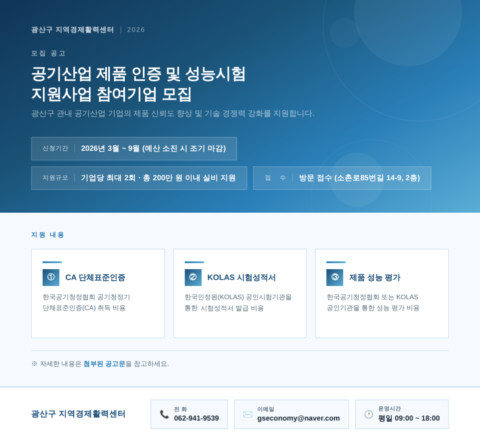 (광주 광산구 지역경제활력센터) 2026년 공기산업 제품 인증 및 성능시험 지원사업 참여기업 모집 안내