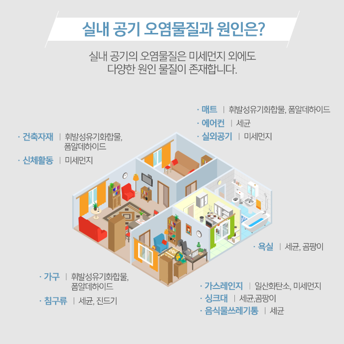 미세먼지란? : 눈에 보이지 않을 정도로 아주 가늘고 작은 직경10㎛ 이하의 먼지 입자를 말하며, 숨을 쉴 때 호흡기관을 통해 폐로 들어와 폐의 기능을 떨어뜨리고 면역력을 약하게 만듭니다.